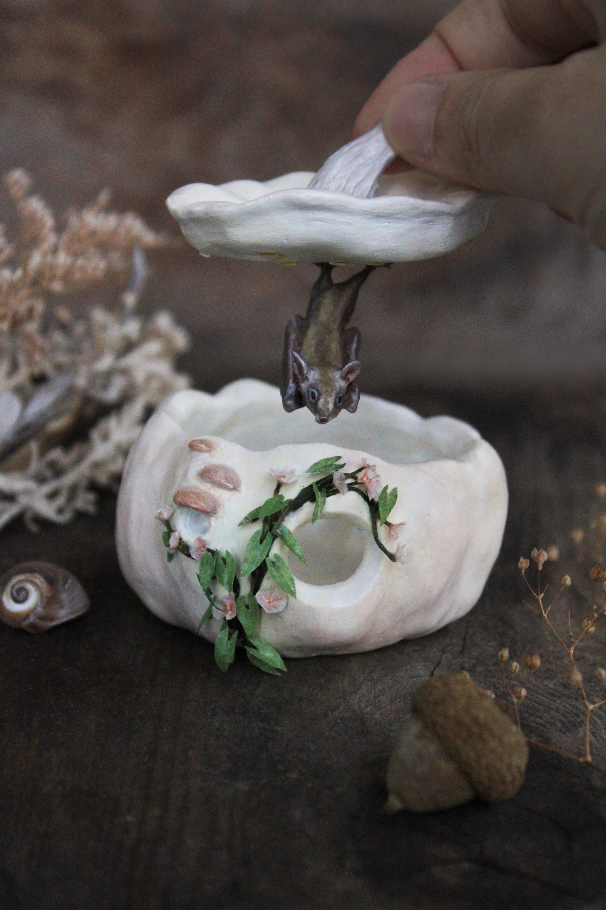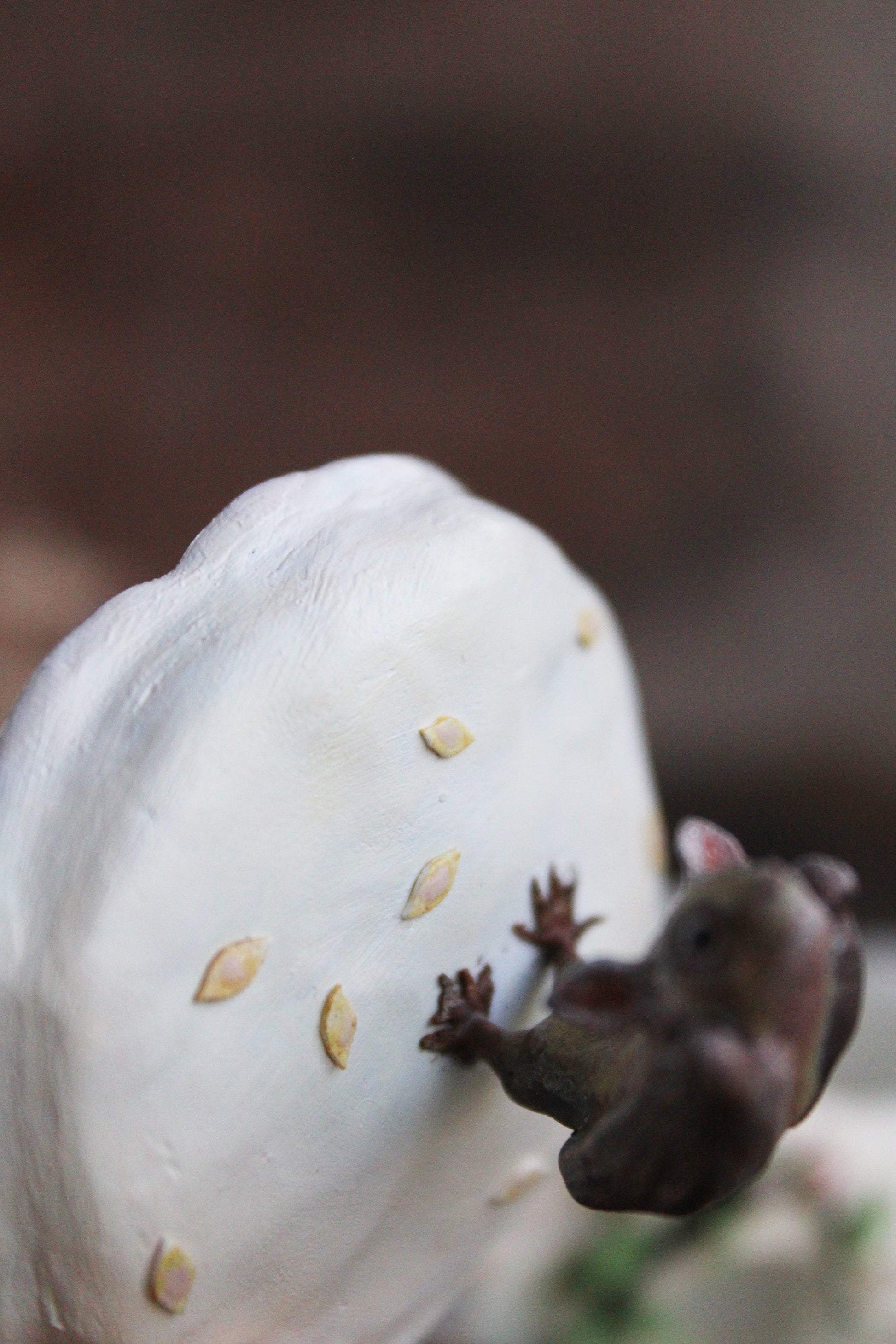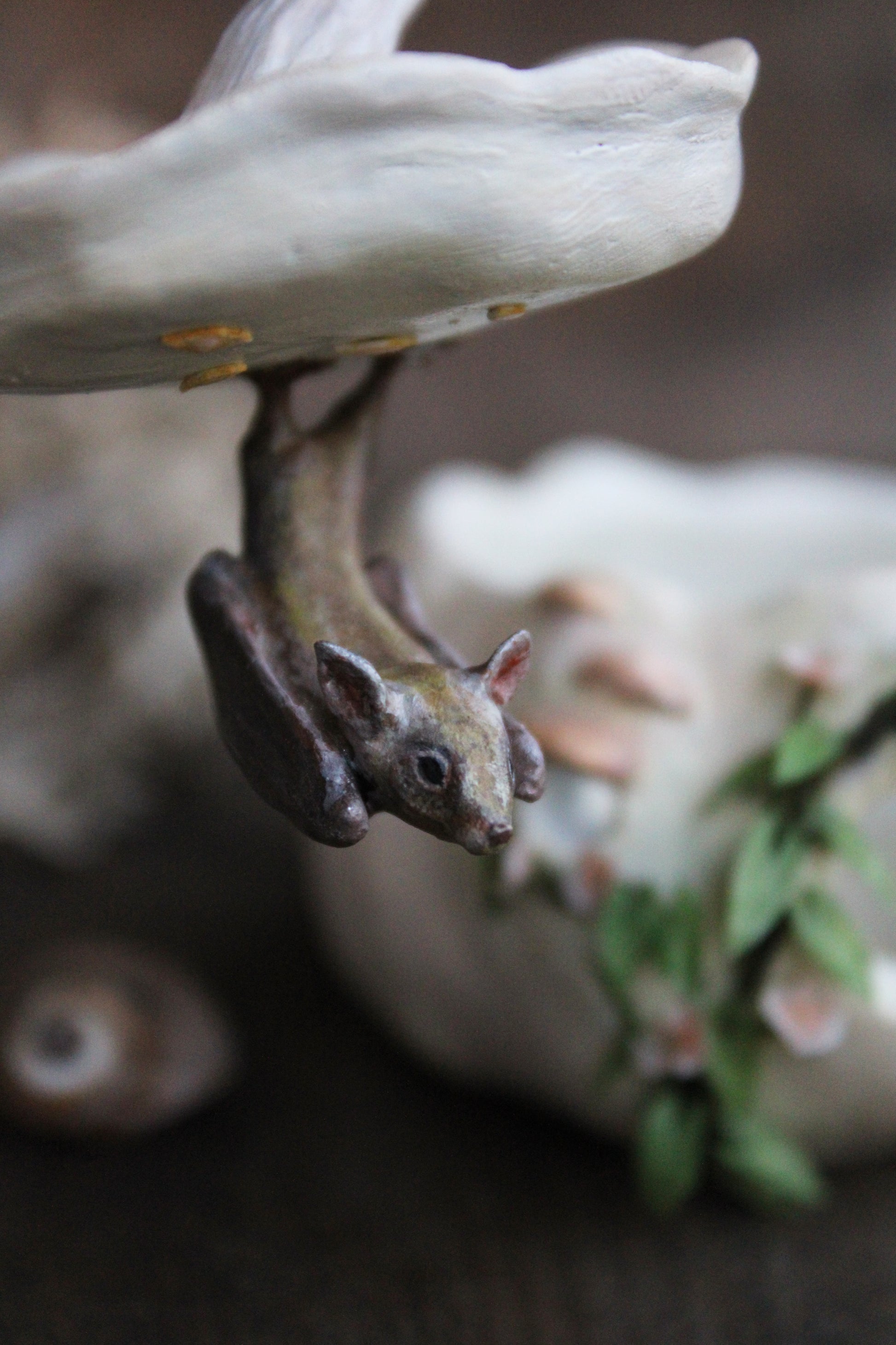 Hand-sculpted and painted lesser long-nosed bat and white pumpkin