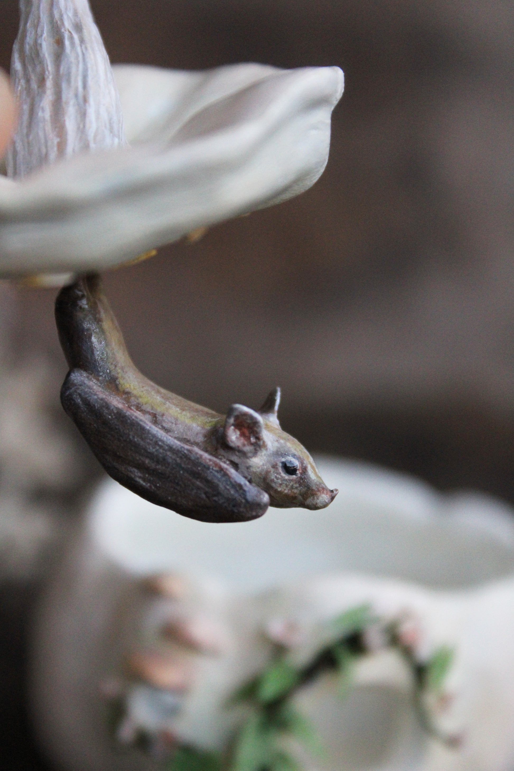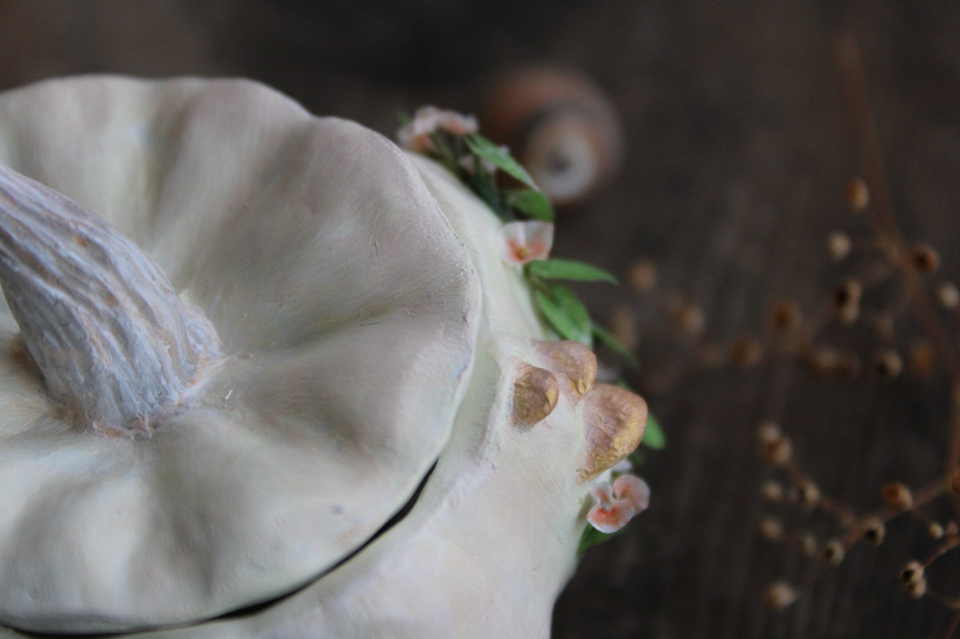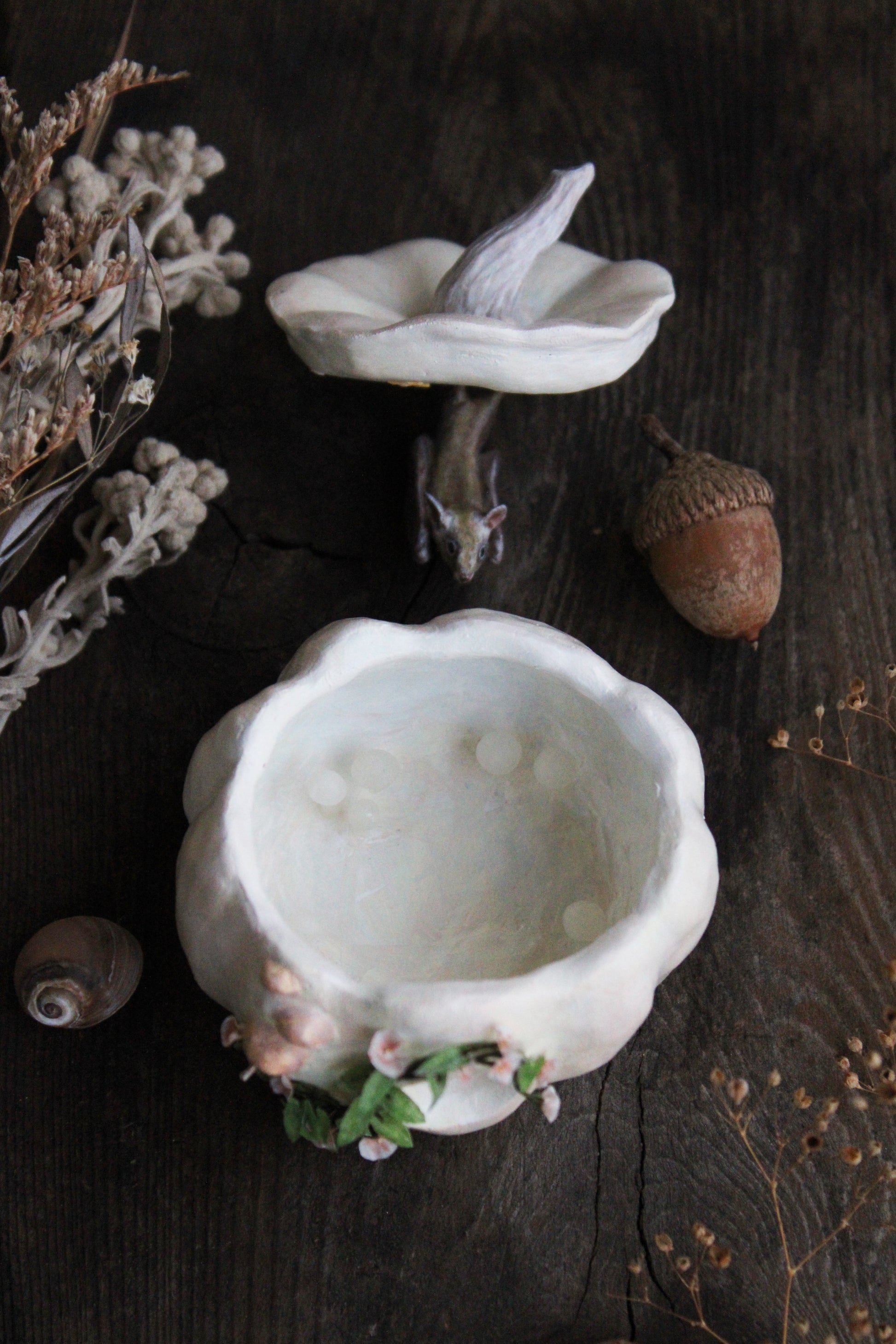 Hand-sculpted and painted lesser long-nosed bat and white pumpkin