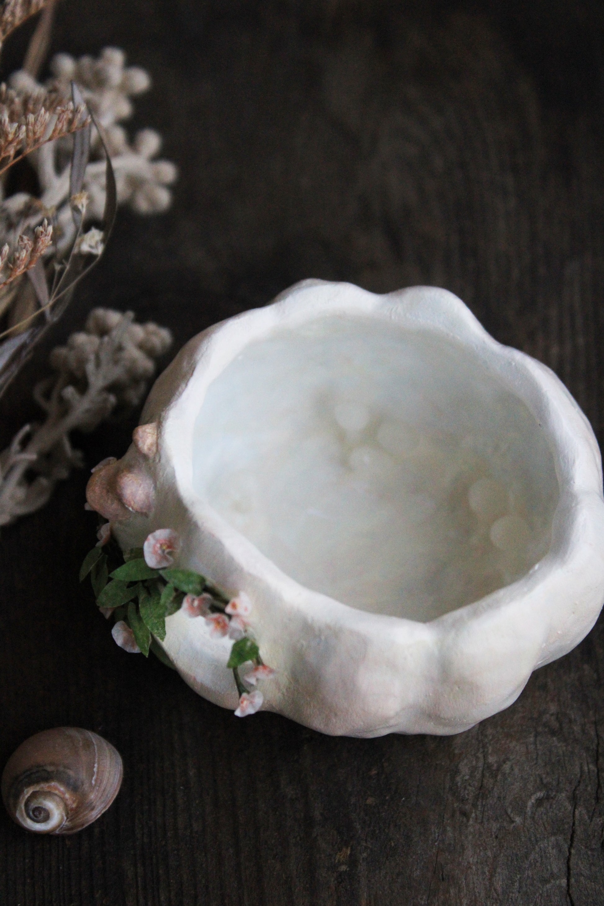 Vining datura moonflowers were crafted from paper, wire and paint