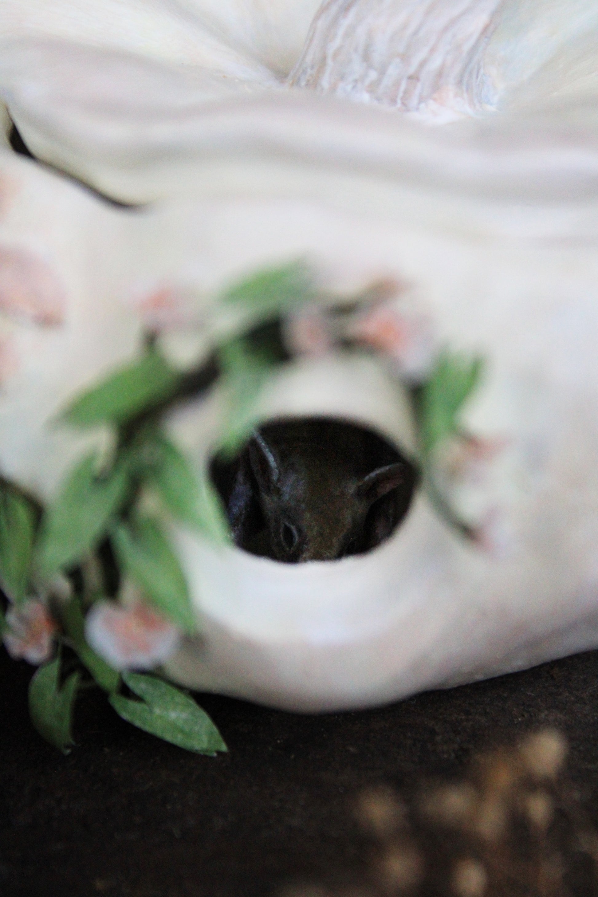 At least one pumpkin home is made each year in the Autumn. This one is inspired by a tiny long-nosed bat that lived in our patio rafters throughout the summer evenings.