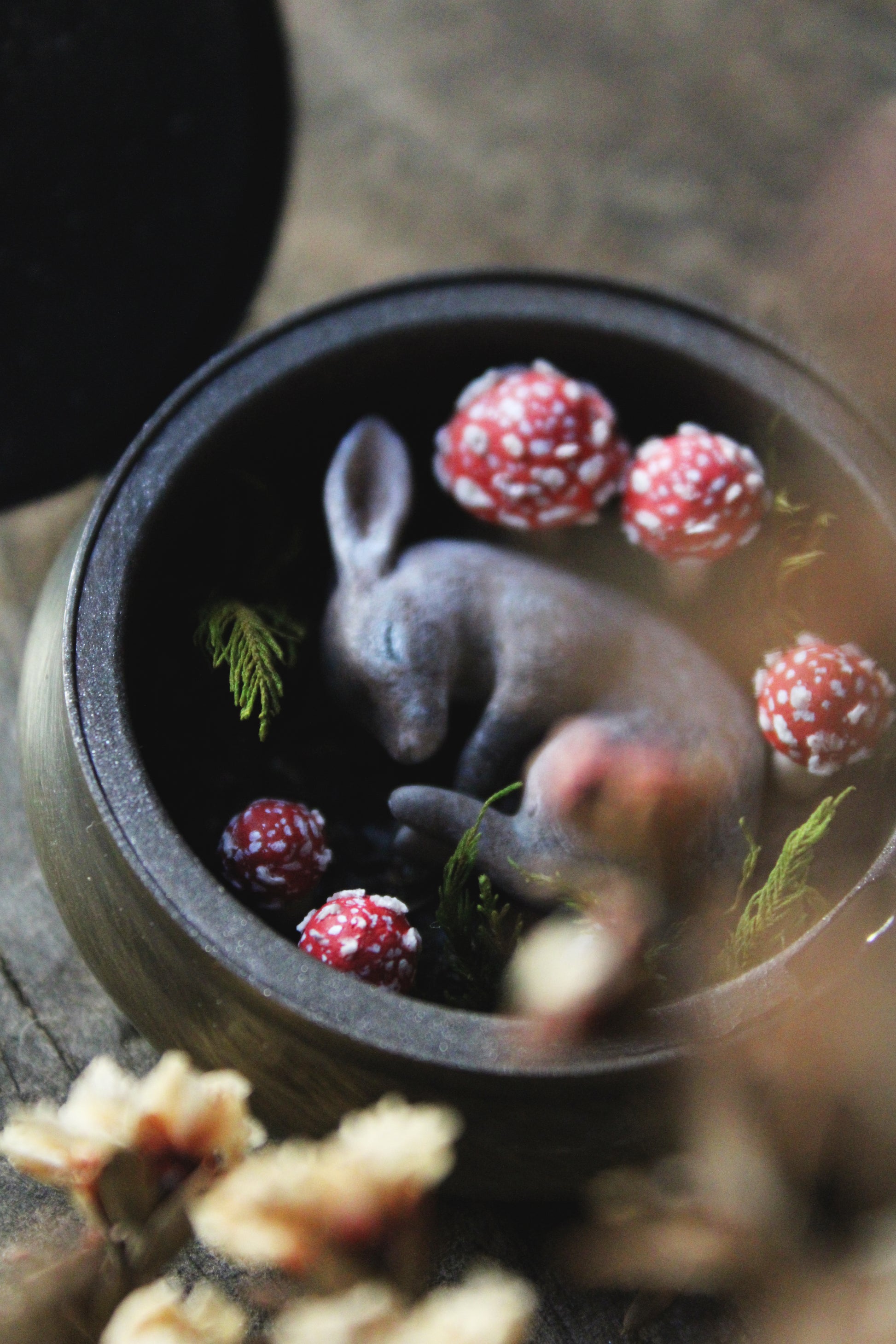 Hand-sculpted and painted sleeping cottontail rabbit and amanita muscaria