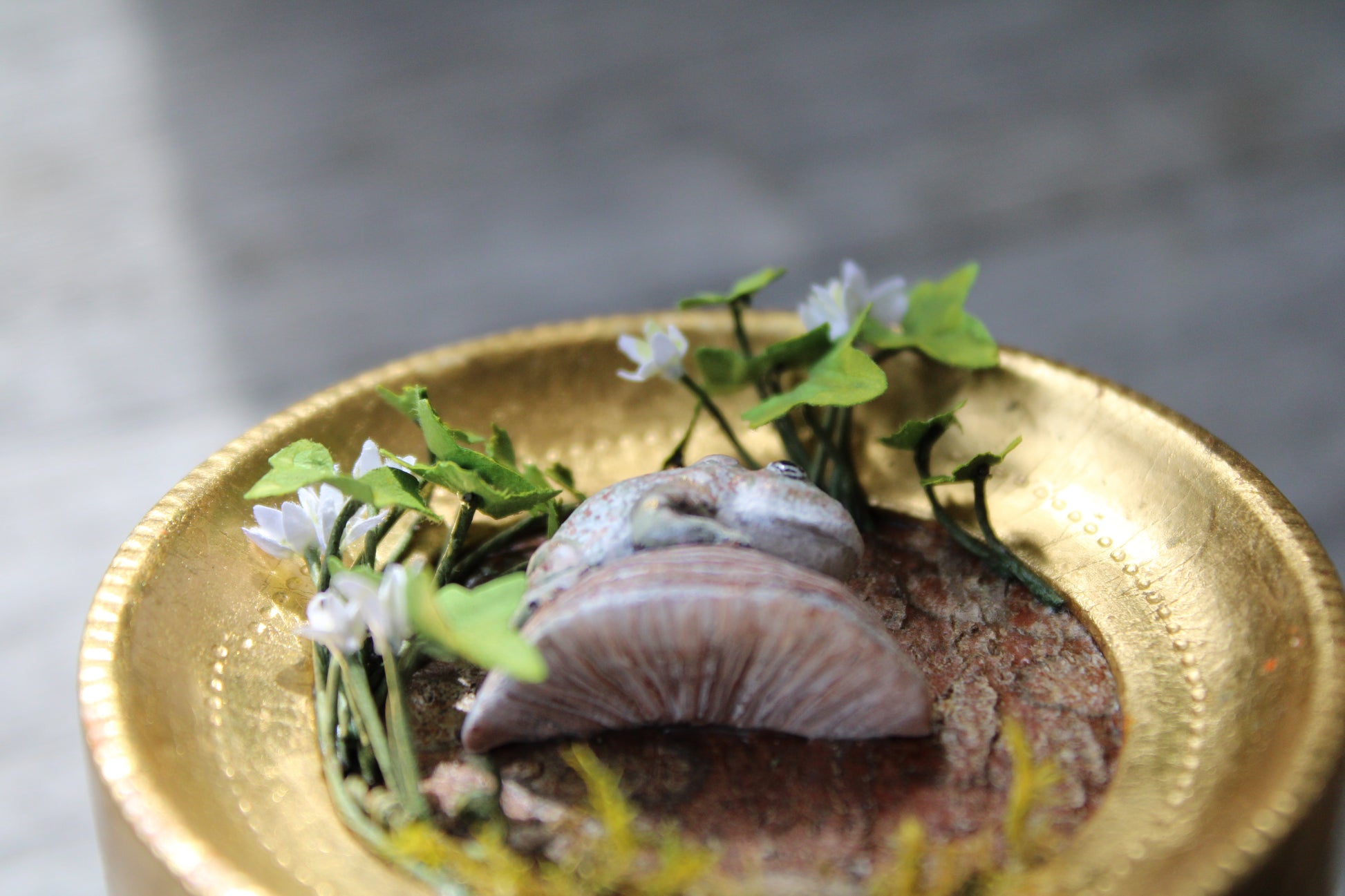 Hand-sculpted and painted arroyo toad and shelf mushroom